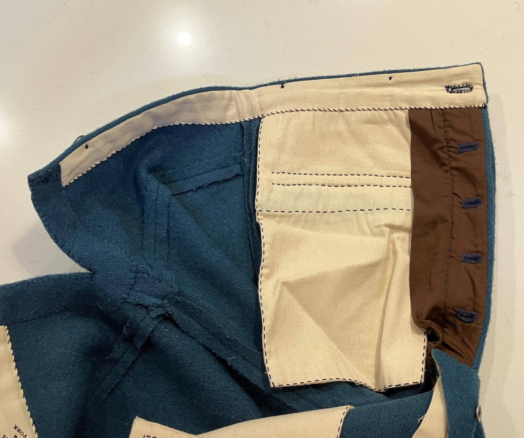 We examined and studied the original on two separate occasions, taking copious notes and photographs, and we measured all seams. All details displayed on this heavily machine sewn garment are reproduced. We matched the flannel and lining material in color and weight and had custom woven fabric produced. The contractor’s and inspector’s stamps were faultlessly reproduced and correct Scovilll Federal Eagle buttons were specially made to adorn the coat.